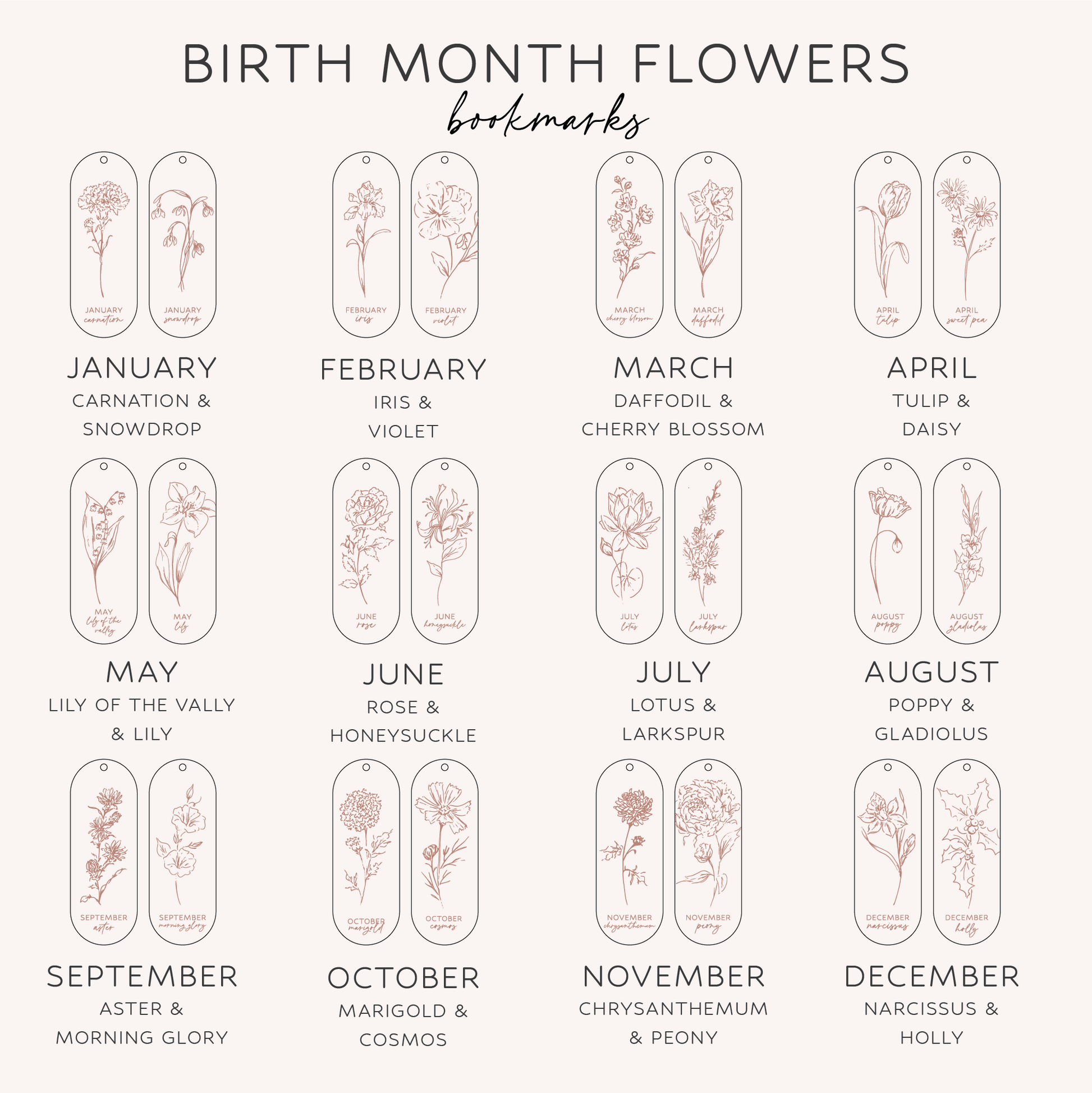 Perfect for stocking stuffers and personalized gifting, this file set includes 24 hand-drawn birth month flower bookmarks ready for laser engraving (see second photo for flower list).
