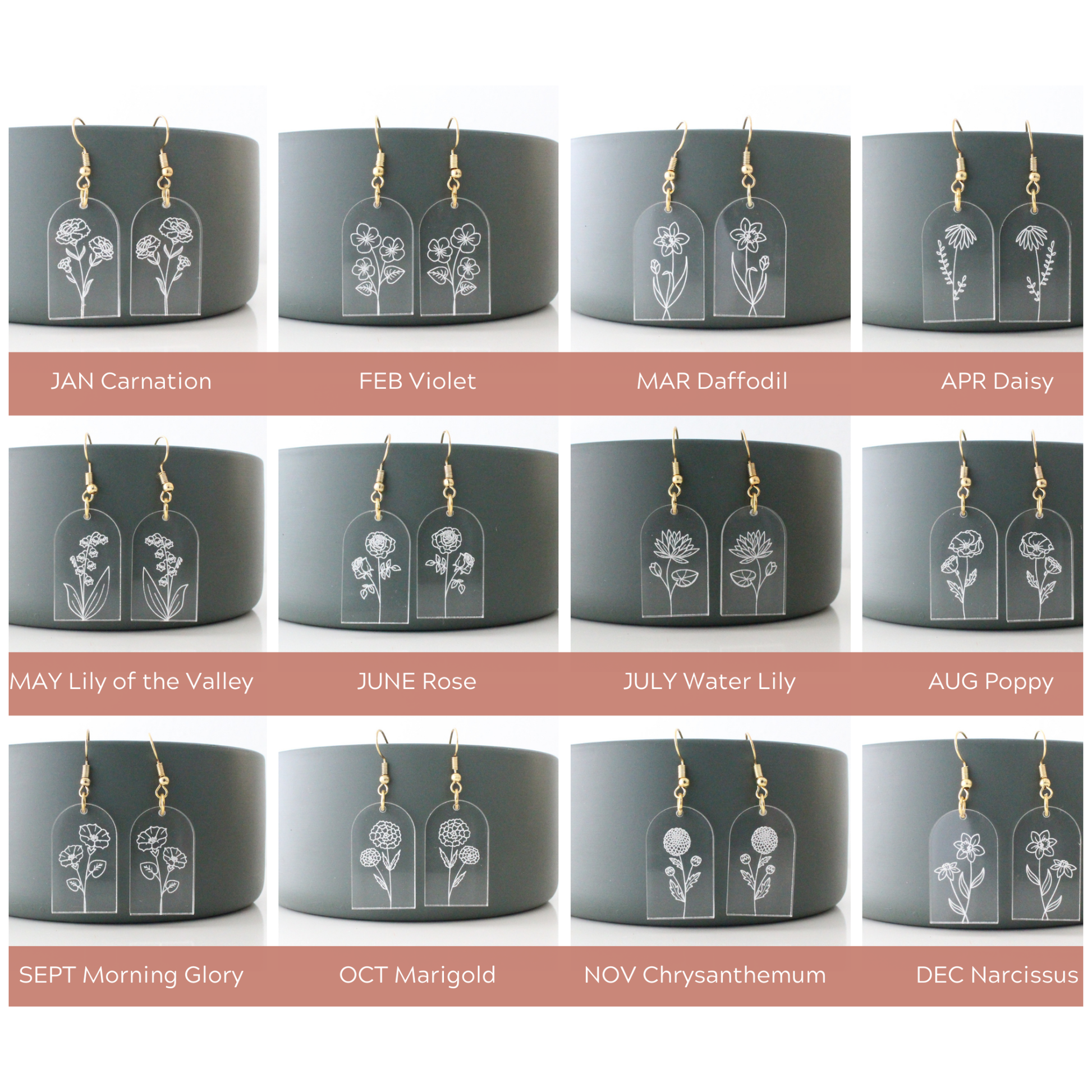 This commercial use file set includes twelve hand-drawn birth month flowers in both arch and teardrop earring shapes!