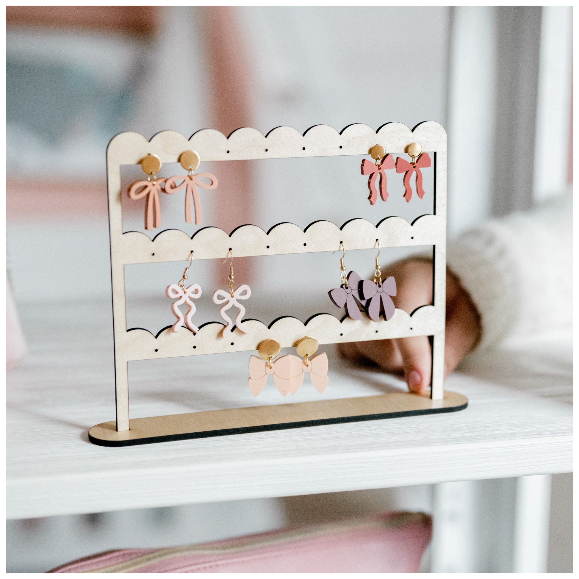 Create a beautiful earring display with this scalloped earring stand! The file includes both a three-tier and two-tier version and can be made from acrylic or wood. Easy to assemble and perfect for vanities, craft booths, or product photos.