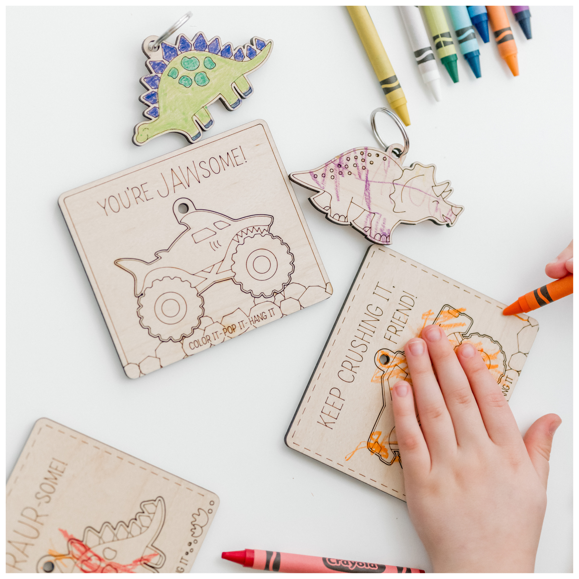 These pop-out dinosaur kits are the perfect hands-on activity for creative kids! Each wooden card features a cute dino they can color or paint, then pop out to turn into a keychain or ornament.