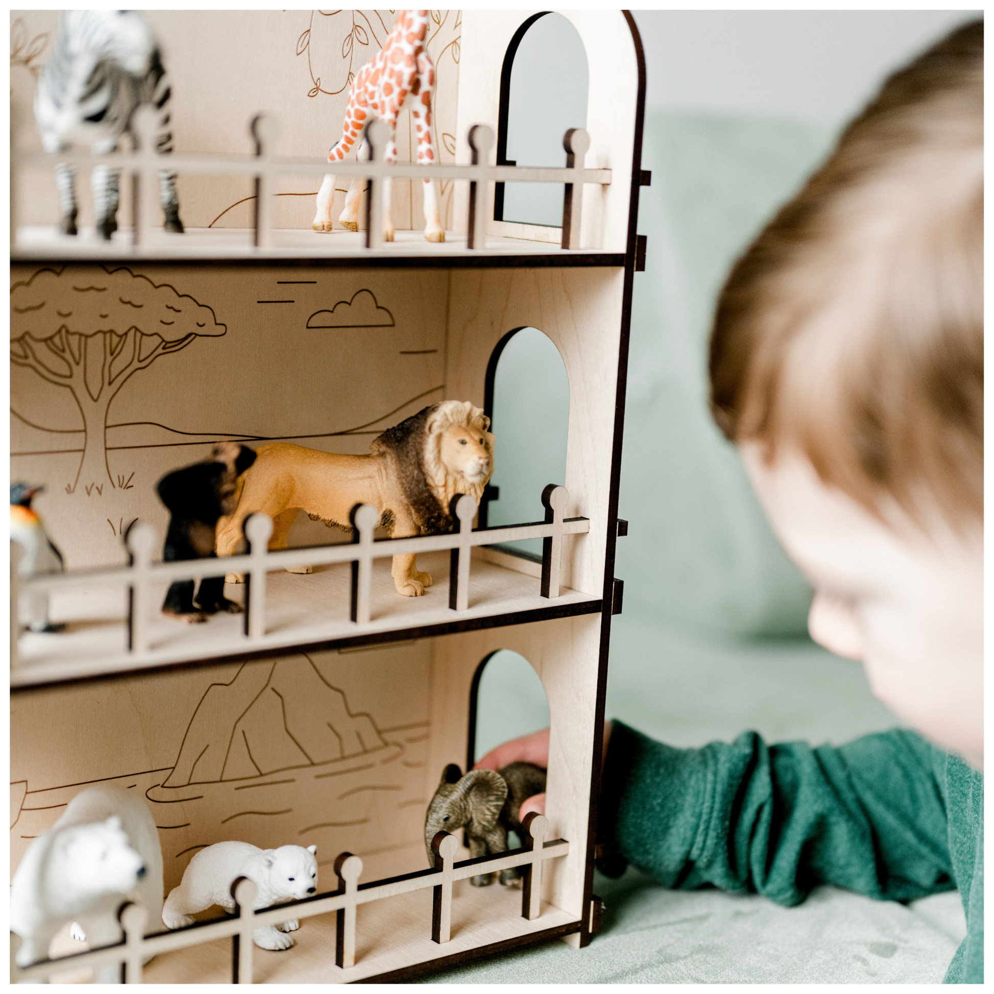 This wooden zoo animal holder is the perfect way to display all your little one’s favorite figurines! Designed with three roomy shelves and a playful zoo backdrop, it turns any collection into a charming display. Choose from two styles—engraved or scored. A beautiful addition to playrooms, nurseries, or gift giving for animal-loving kids!